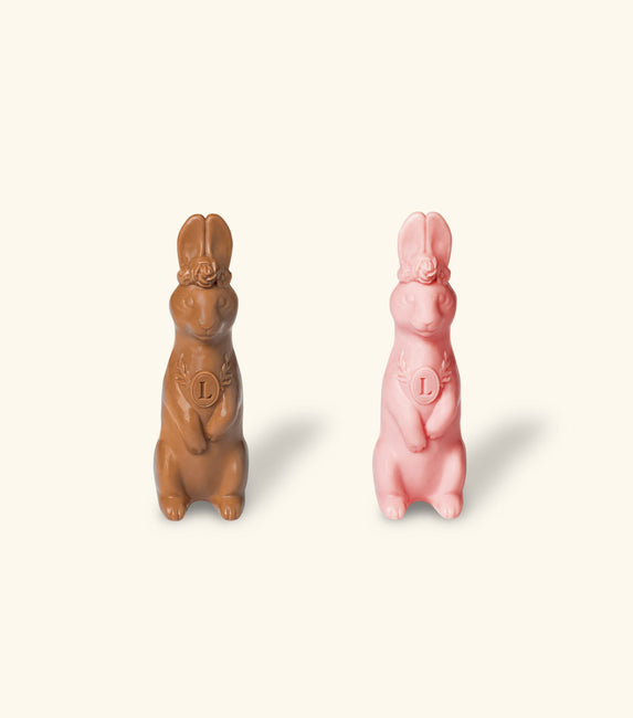 Celebrate Easter with a playful yet refined creation from Ladurée. This charming Easter gift set features two chocolate rabbits crafted in smooth milk chocolate and delicate pink chocolate, surrounding Lala the Bunny at the center with caramelized dried fruits for a delightful balance of texture and flavor.