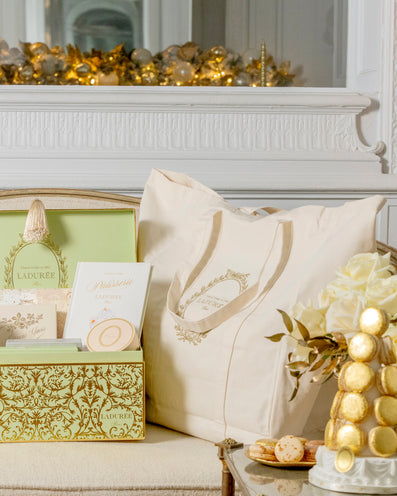 For the 2025 holiday season, Maison Ladurée invites you into a marvellous garden inspired by the Greek myth of the Hesperides, where amid the blossoms and trees stand an apple tree bearing golden fruit.