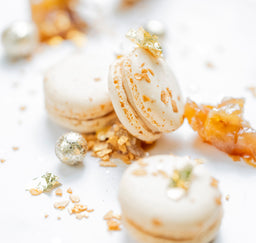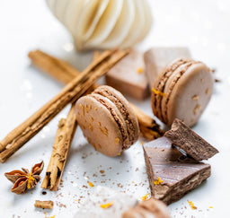 ChristmasTwo macarons shells sprinkled with golden crêpes dentelles shavings, filled with spicy chocolate marshmallow and cocoa nibs.