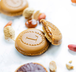 Une coque craquante au chocolat caramel avec un cœur praliné cacahuète-amande et un biscuit sablé enrobé de chocolat noir.