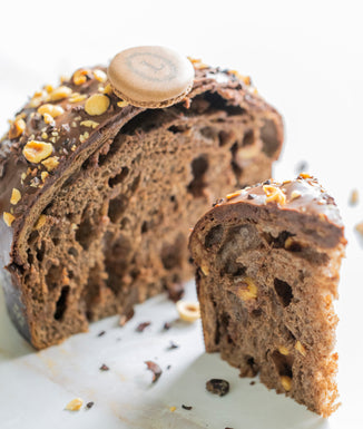 Un panettone riche et généreux, garni de gianduja chocolat, d’éclats de noisettes croquants et de grué de cacao, et couronné d’une délicate coque de macaron.