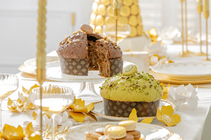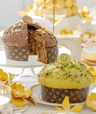 Un panettone généreusement garni de pistache, sublimé par un gianduja pistache onctueux et des éclats de pistaches croquants, puis couronné d’une délicate coque de macaron.