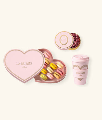 Un écrin en forme de cœur, deux façons de déclarer sa flamme : l'assortiment signature réunit les grands classiques de la Maison, tandis que la version « Déclaration » dévoile le macaron exclusif Caramel & Thé noir, cœur délicat au sein d’un assortiment de macarons vanille, rose, framboise et fleur d’oranger..